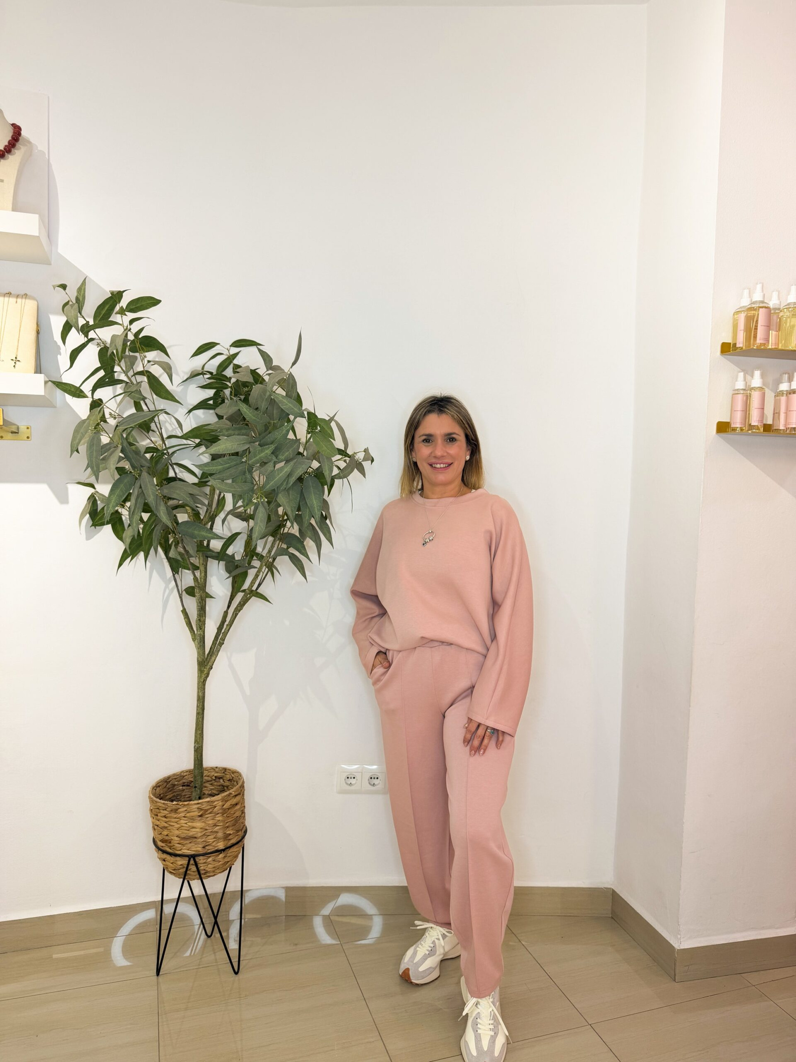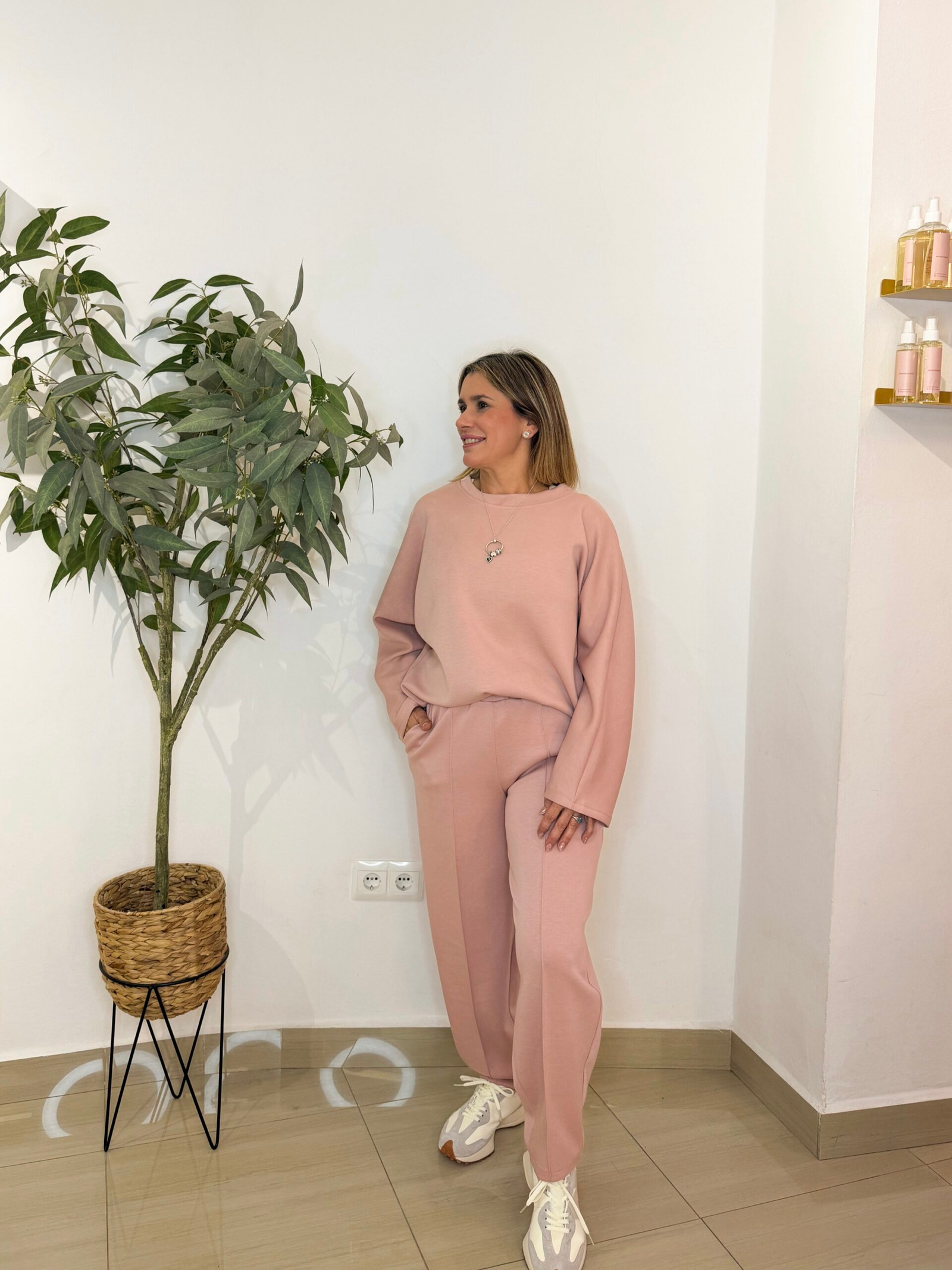 Este conjunto está formado por un pantalón con cintura elástica y bolsillos delanteros, y una sudadera de cuello redondo con caída suave. Dos prendas pensadas para acompañarte con estilo en tu día a día, sin renunciar a la comodidad.